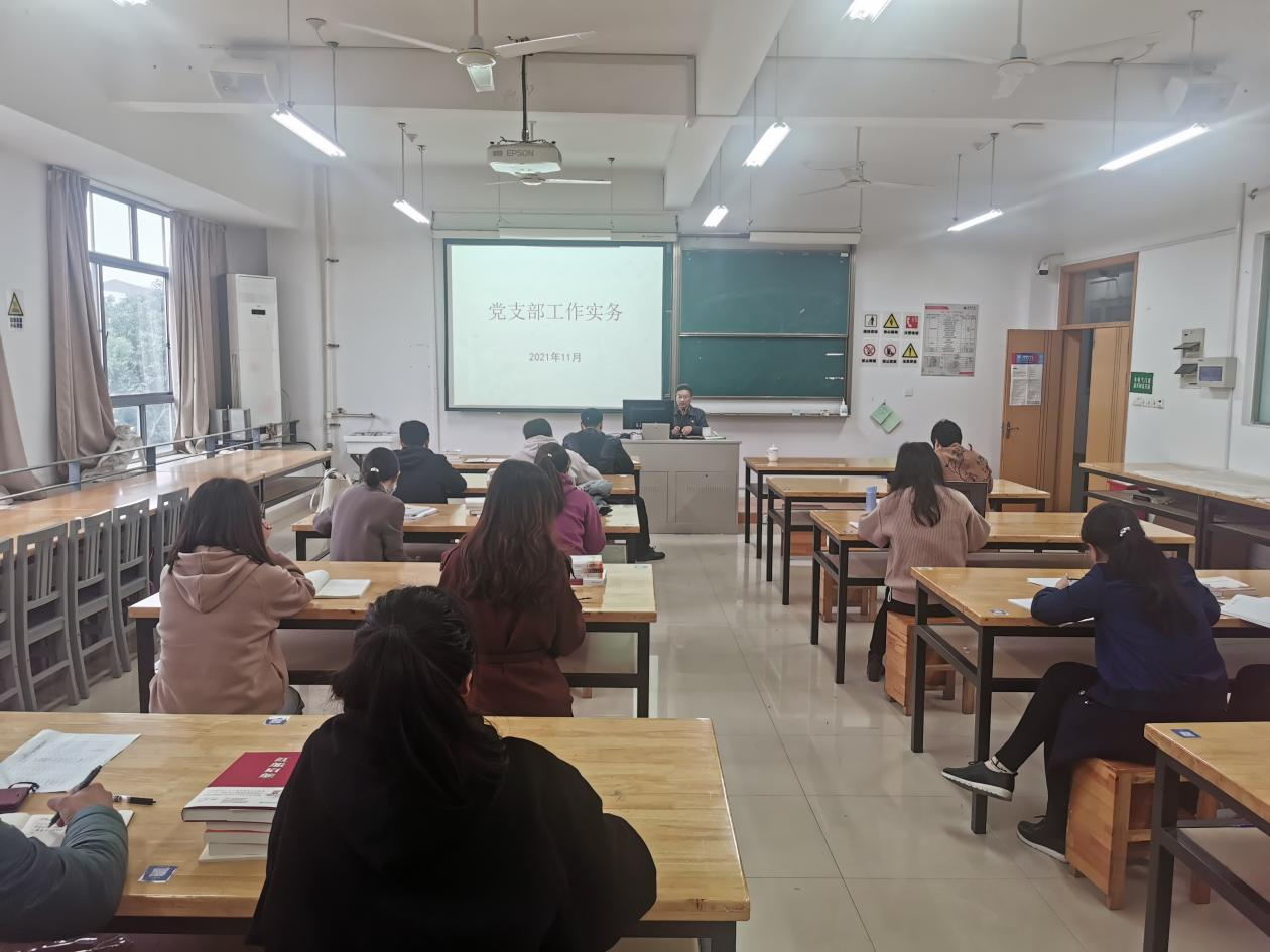 接下来由姚颖超做基层党务工作实务培训,他结合《中国共产党支部工作条例(试行)》《中国共产党普通高等学校基层组织工作条例》等文件要求,从基层党组织设置、党的组织生活两方面进行详细的讲解,重点强调要规范进行“三会一课”、主题党日、谈心谈话等活动,最后对党员发展的流程以及期间会出现的问题提出了相应的建议对策。