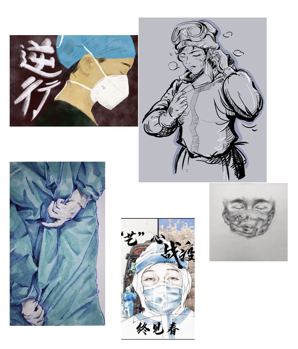 设计学子积极响应学校抗击疫情的指令,虽不能与医务人员、警察等一线工作者并肩,但他们充分发挥艺术特长,以“艺”抗疫,用艺术作品感谢一线的生命守护者,用实际行动配合和响应学校号召,用振奋人心的作品表达“万众一心,抗疫终将胜利!”的期待和信心。
