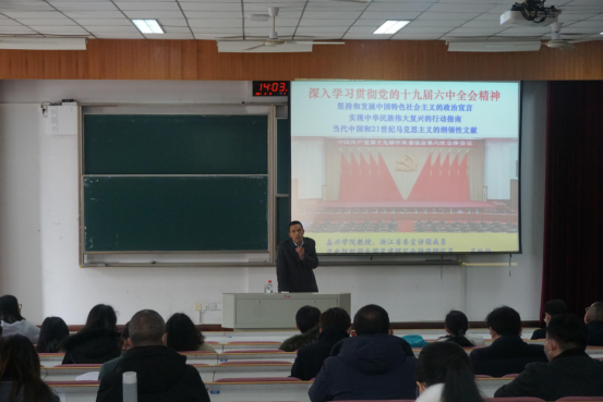 为深入学习贯彻党的十九届六中全会精神,深刻理解党百年奋斗的重大历史意义,全面推进党史学习教育,12月15日下午,365best体育亚洲官网党委邀请嘉兴学院红船精神研究中心教授肖纯柏在博闻楼(原七号楼)报告厅为全体教职工作十九届六中全会精神专题宣讲报告,院党委书记黄芳芳主持。