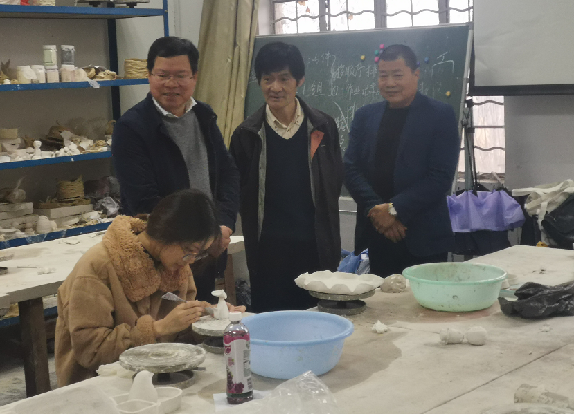 学院党政领导对周兴观一行表示热烈欢迎,并介绍了学院办学特色、校企合作、产教融合、师生参展参赛、设计成果转化等情况。周兴观一行先后参观了北区陶艺实验室、艺术设计产学研成果展示中心,并与365best体育亚洲官网师生亲切交谈黑陶制作工艺。