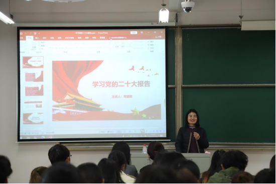 常老师首先简要介绍了党的二十大报告的主要内容,强调党的二十大是在全党全国各族人民迈上全面建设社会主义现代化国家新征程、向第二个百年奋斗目标进军的关键时刻召开的一次十分重要的大会。她表示,党的二十大全面总结了过去五年的工作和新时代十年的伟大变革,十年前面对严峻的形势,党中央义无反顾进行具有许多新的历史特点的伟大斗争,党和国家事业取得历史性成就、发生了历史性变革。