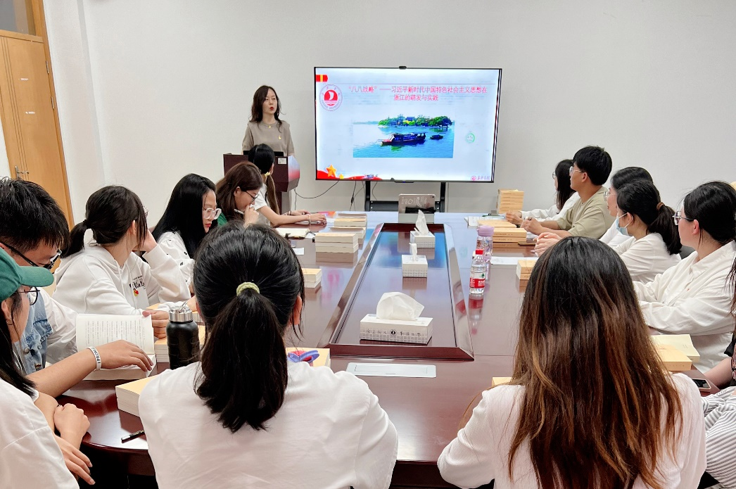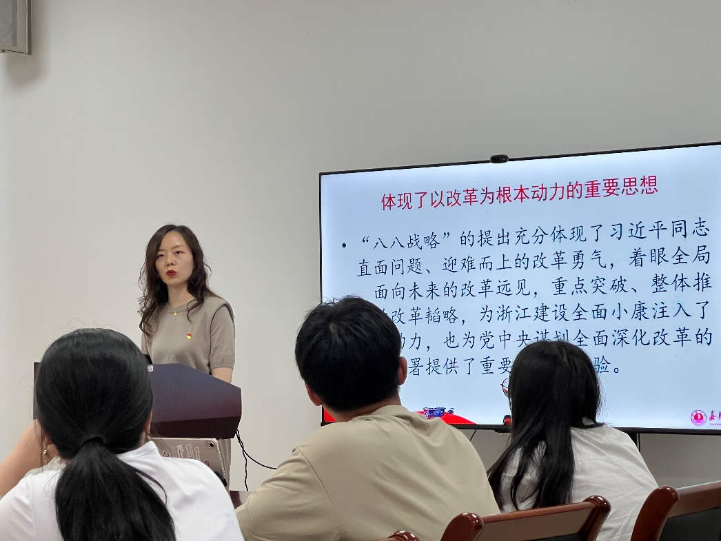 活动以支部书记宣讲和党员集中自学两种方式相结合。支部书记刘洋老师从为什么提出“八八战略”,“八八战略”的主要内容和“八八战略”的重大意义三大模块进行解读。她结合具体案例讲述当时“先成长先烦恼”的浙江所面临的的机遇和挑战,通过自身和身边人的感受描述实施“八八战略”以来发生的“浙江现象”和“浙江奇迹”,让全体党员对“八八战略”有了更加全面深刻的理解。支部党员郑佳妮表示,印象最深的是习近平总书记担任浙江省委书记时的“三个跑遍”和“地瓜理论”,启发我们无论做学问还是干事业,必须脚踏实地,还要把眼光放长远,修炼内功的同时海纳百川,才能立于不败之地。