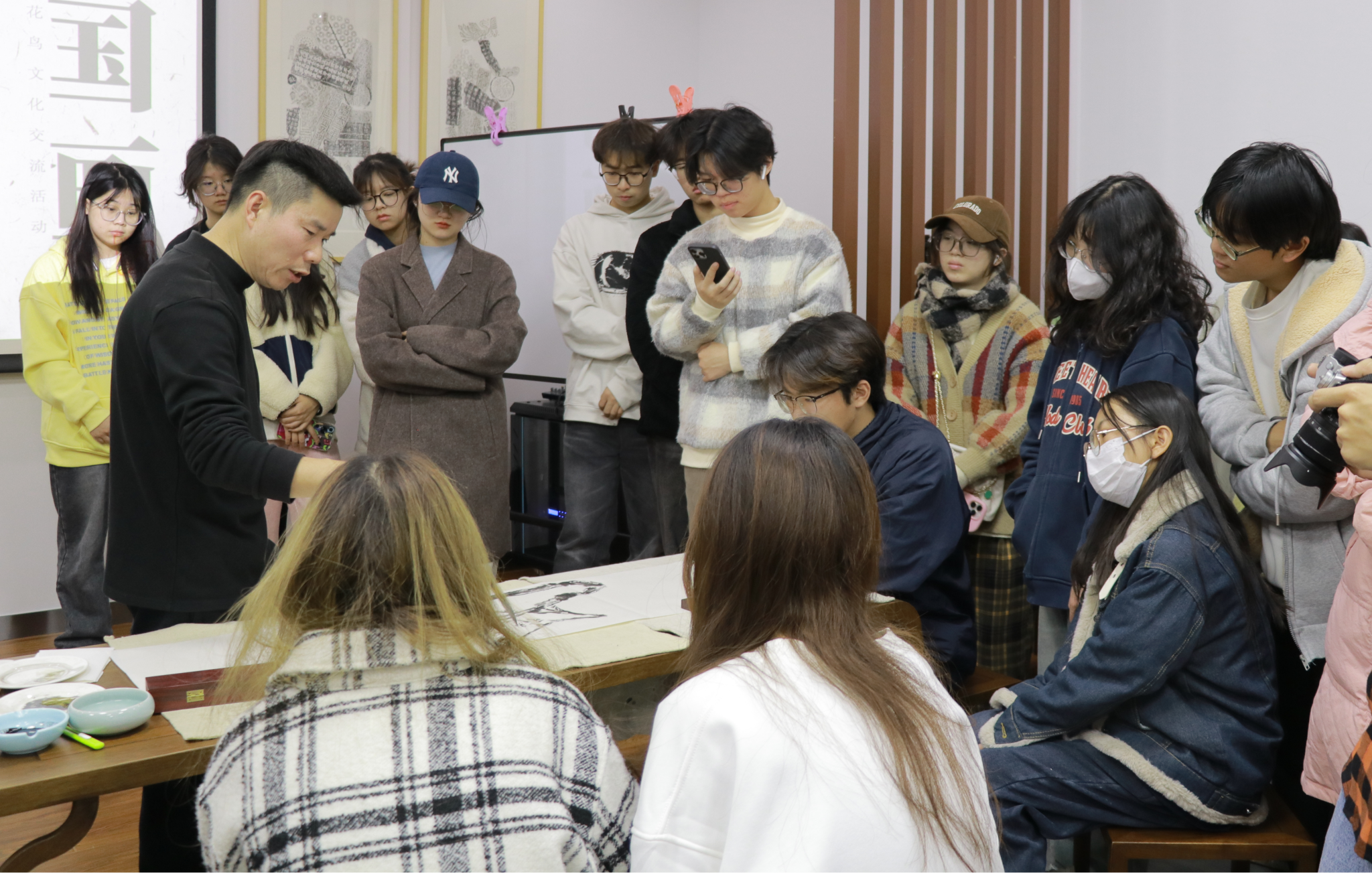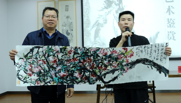 本次交流活动以《中国画艺术鉴赏》为主题,陈老师从岩画为始,选取中国历代经典水墨作品溯源中国画的发展和演变,用山水花鸟意象的细节深挖工笔与写意的区别与内涵。此外,陈老师还以“兰草”和“墨梅”为主题,通过现场实践教学的直观方式,为同学们演示笔墨技法的应用,在场的同学被深深吸引,皆目不转睛的围绕一旁。“陈老师实践教学时胸有成竹的样子一定是建立在其深厚的国画功力上的,他倾囊相授、无私的教学态度令人敬佩,这次讲座收获太大了。”刘文乐同学感慨道。