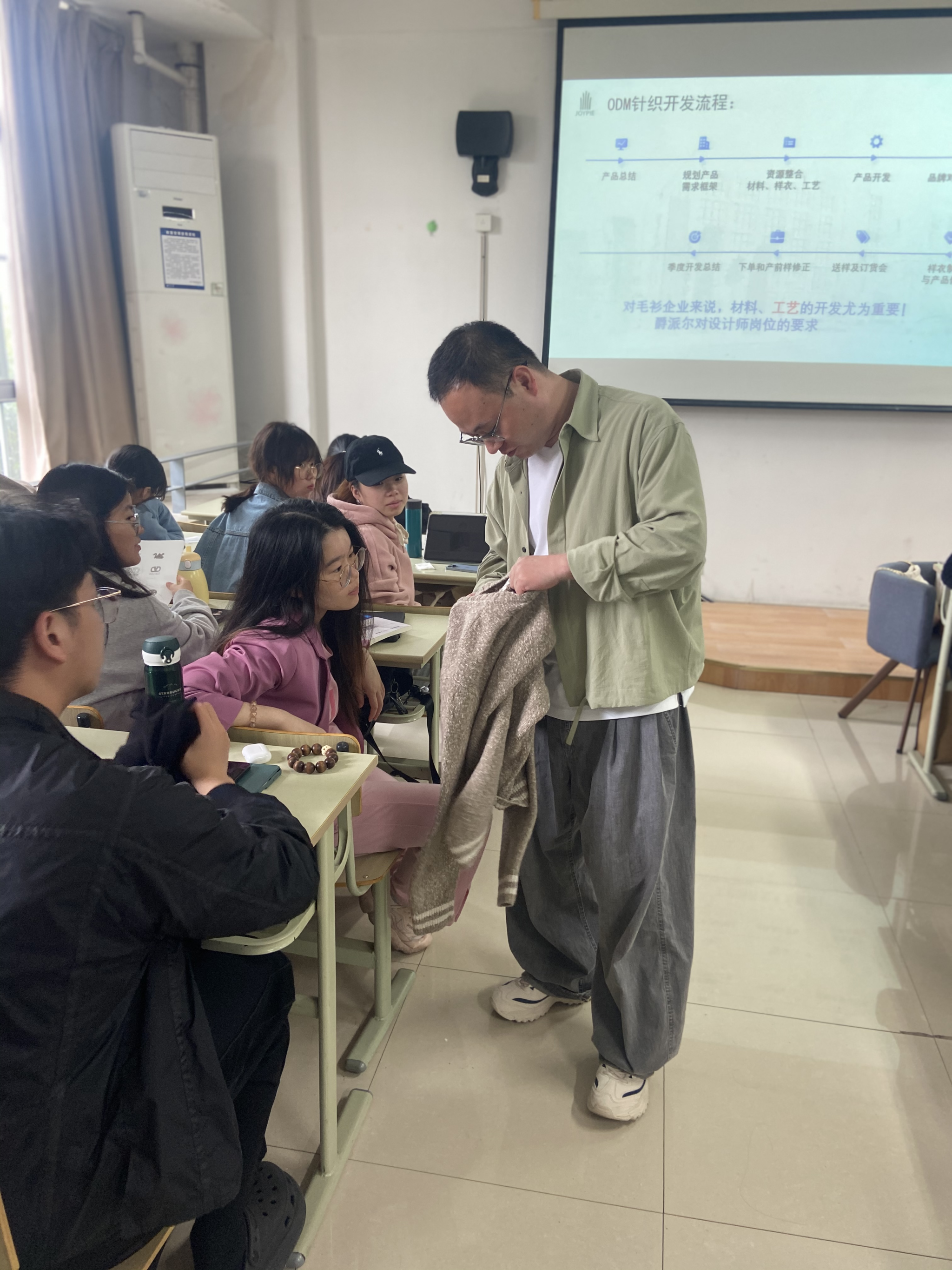 课上,杨卫勤总监讲述了自身毕业后进入爵派尔服饰公司工作至今,一路从实习生到设计总监19年的职业成长经历。后从时尚买手这一职业说开来,介绍了买手的工作内容、职责、基本素养和能力,同时结合他的亲身实践、十多年的工作经历,给同学们讲述了如何实现吊染工艺突破的案例,以及如何挖掘优质供应商的案例。最后,杨总监还将服装面料带到课堂,让同学们能面对面地触摸、感受各色的面料,加强了学生对面料的理解。