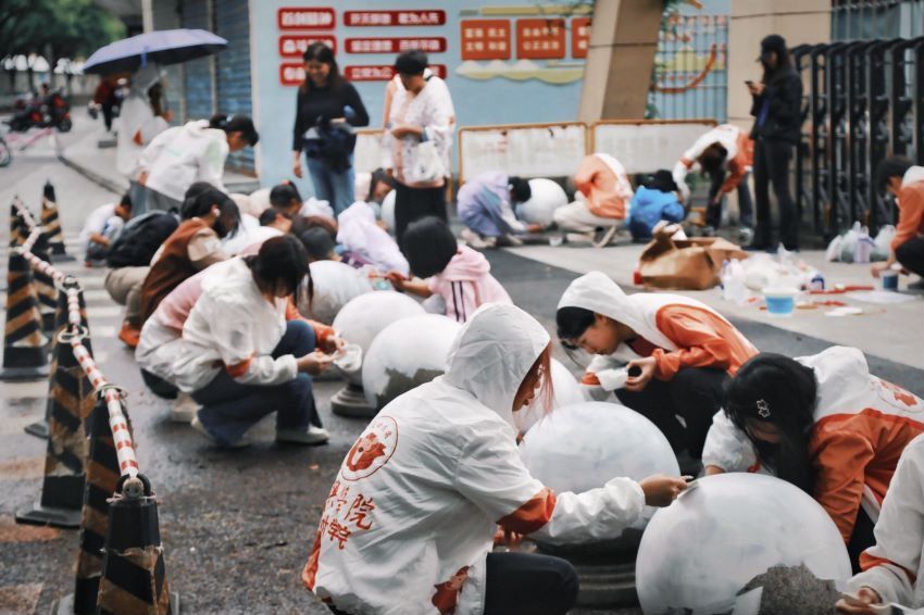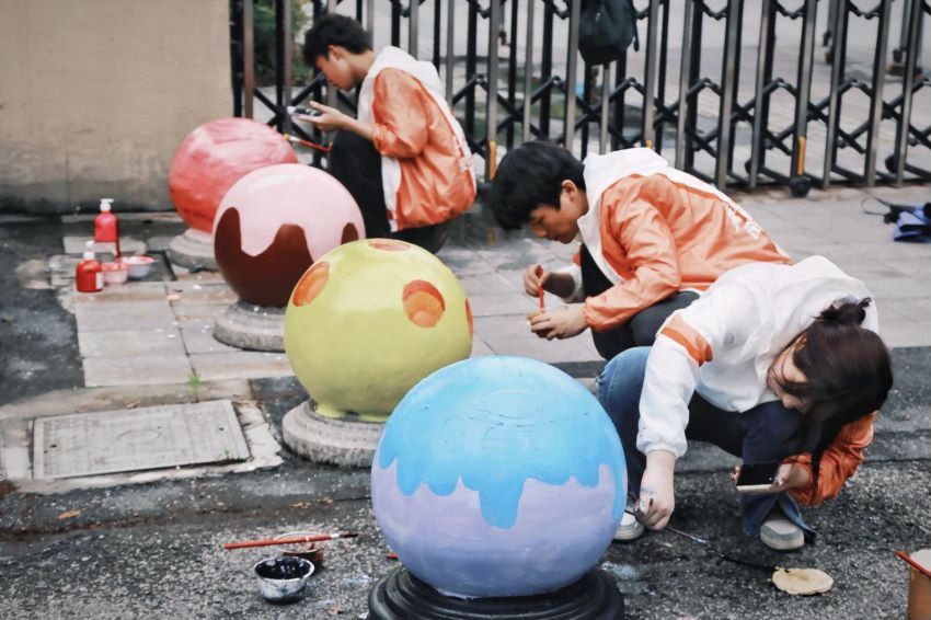 早上9:00,志愿者们来到街道,以分组形式在艺术小学、创业学校、栅堰幼儿园门口进行艺术彩绘,手把手带领街道儿童,用色彩和创作为30余个灰色、光秃秃的石墩穿上外衣,打造儿童友好街道的“色彩群岛”。此次艺术作品以儿童友好标识元素为主体,结合卡通创作,将单调的石墩变为街道的亮点,同时以大朋友小朋友牵手共创的形式完成,引得路人驻足观看和街区居民的交口称赞。