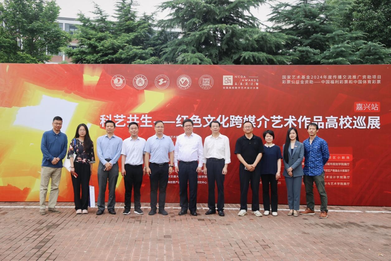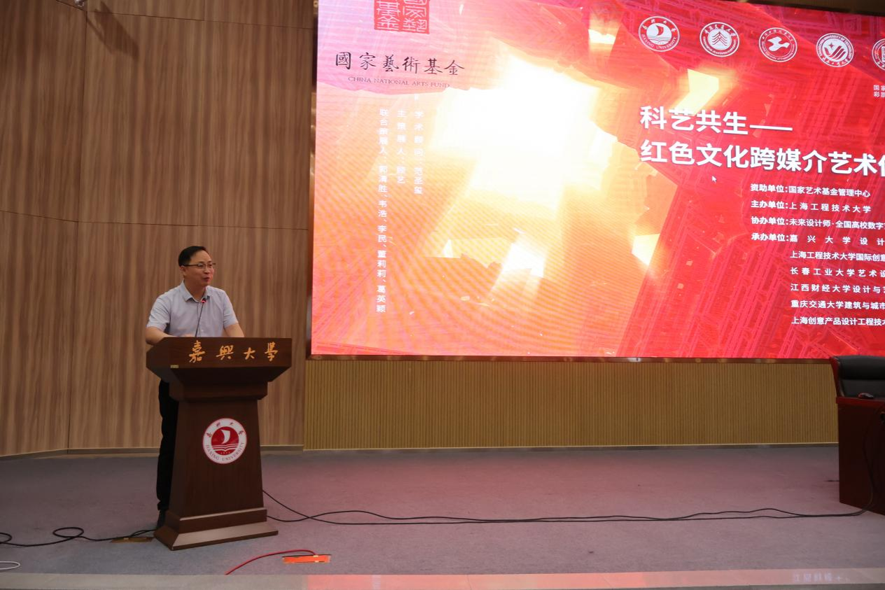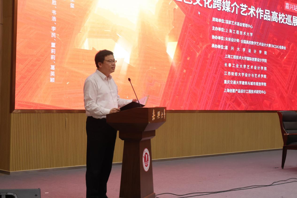 6月12日上午9:30,国家艺术基金项目“科艺共生——红色文化跨媒介艺术作品高校巡展”在嘉兴大学行政楼报告厅举行第三场展览开幕式。嘉兴大学党委委员、副校长王立玮,上海工程技术大学党委常委、副校长夏春明,上海工程技术大学国际创意365best体育亚洲官网院长顾艺,365best体育亚洲官网院长韦浩、党委书记蒋建其、副院长裘玉英等出席开幕式。