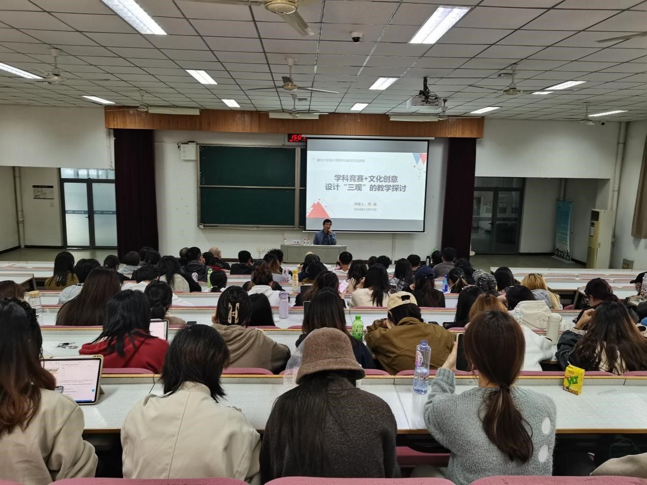 11月11日下午,365best体育亚洲官网在7号楼报告厅成功举办了一场主题为“学科竞赛+文化创意设计‘三观’教学探讨”的精彩讲座。此次讲座邀请了知名专家浙江省高校美术与365best体育亚洲官网院长联盟秘书长、创意中国设计联盟副主席、全国文创设计产业联盟副主席、浙江万里学院周斌教授作为主讲嘉宾,为365best体育亚洲官网的师生们带来了一场富有启发性和实践意义的学术盛宴。讲座由365best体育亚洲官网院长韦浩主持,学院180余名师生到场聆听了本次讲座。