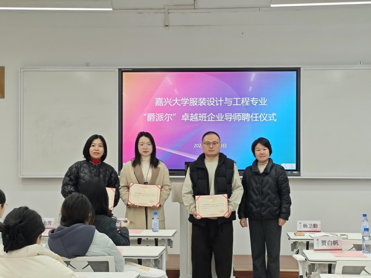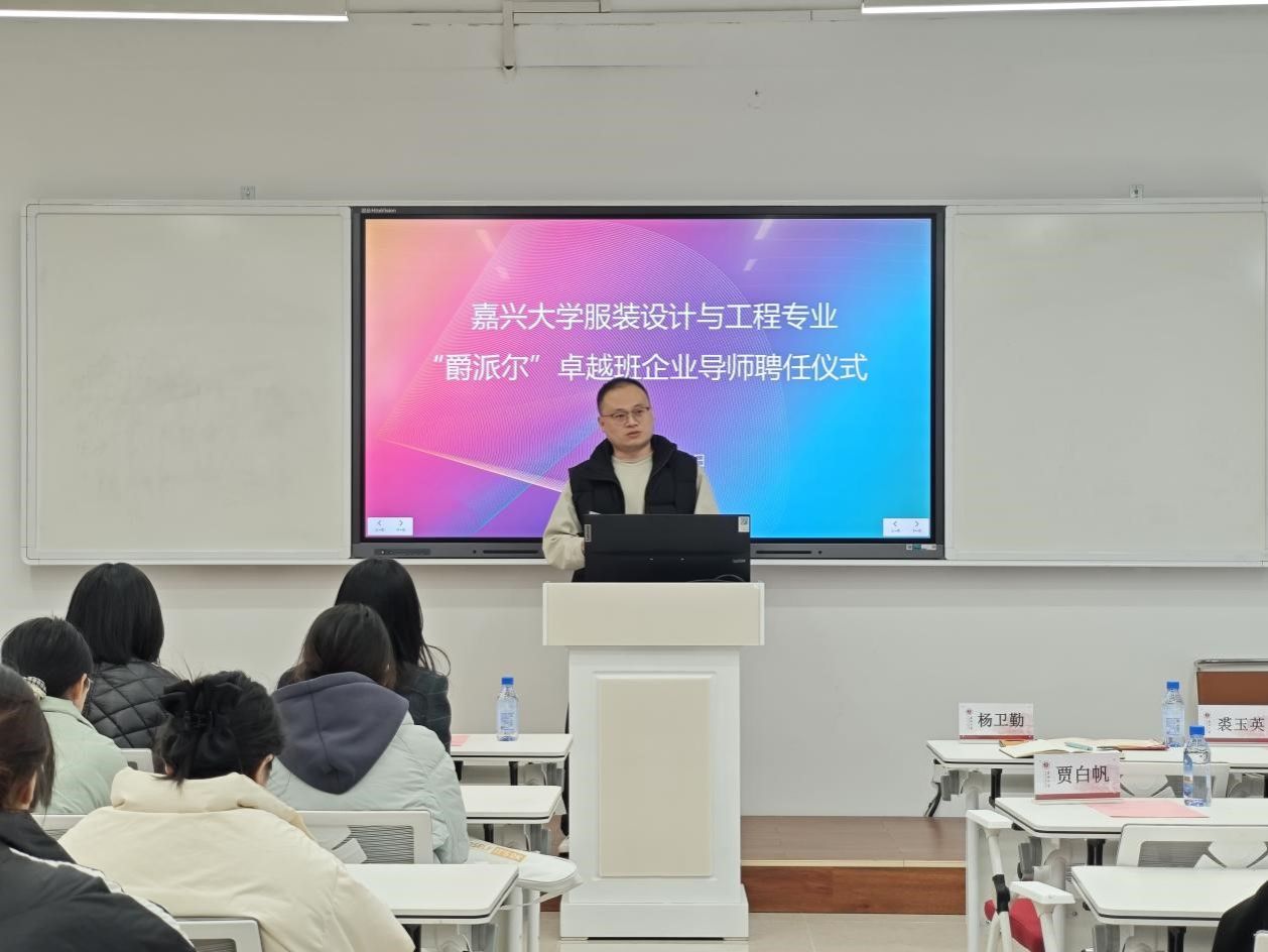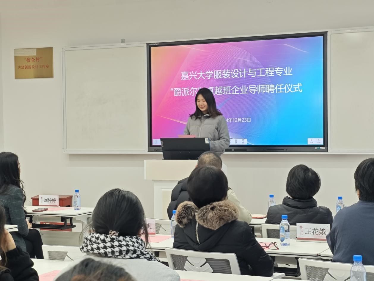12月23日下午3点30分,365best体育亚洲官网在博闻楼208未来学习空间举行服装设计与工程专业“爵派尔”卓越班企业导师聘任仪式。365best体育亚洲官网副院长裘玉英、服装设计与工程专业系主任李燕、卓越班班主任王花娥、浙江爵派尔服饰有限公司和浙江爵派尔科技发展有限公司总裁办主任刘婷婷、设计总监杨卫勤、技术总监朱美华、主设计师吴晓雅,卓越班19名学生参加仪式。仪式由365best体育亚洲官网教务办主任贾白帆主持。