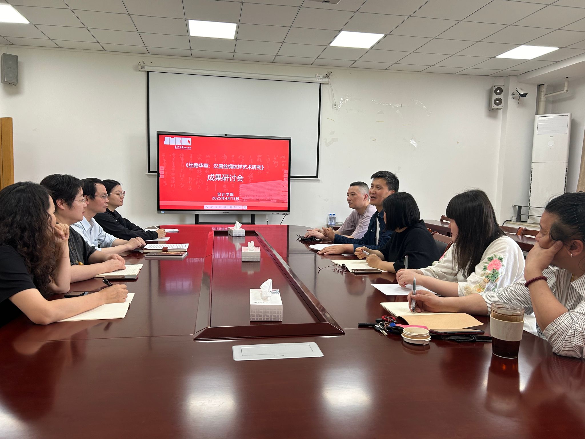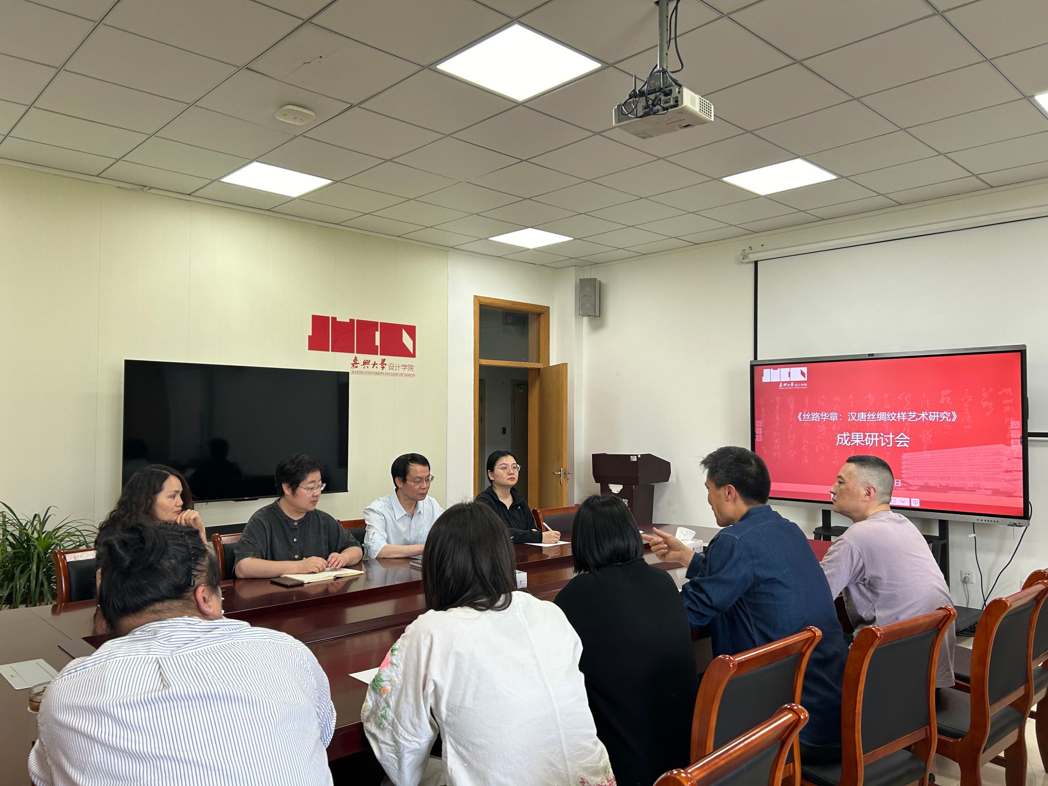 在研讨环节,课题组成员分别从研究范围、内容、创新点等方面开展深入的研讨,教师们针对结项成果进行了互动交流。韦浩院长给予成果充分肯定,认为该专著研究具有理论深度,现代设计转化具有实践价值,在一带一路背景下,丝绸文化是一项值得深入开展的研究工作,韦浩院长希望课题团队继续深入开展研究,取得更多优秀成果。