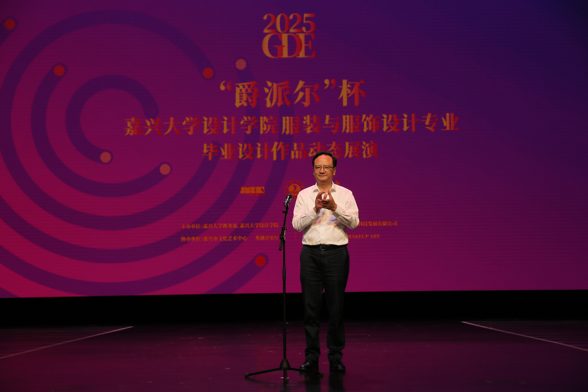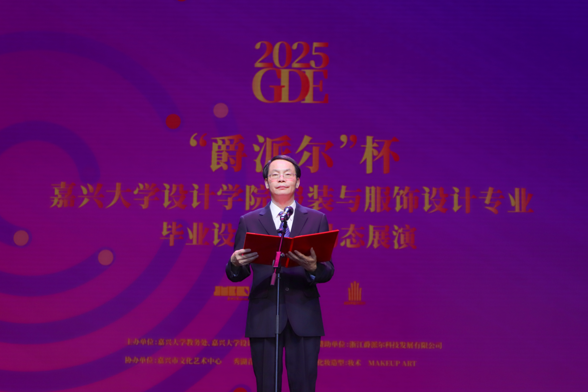 嘉兴市政协副主席、民建嘉兴市委会主委戴铭宣布365best体育亚洲官网2025年“爵派尔”杯服装与服饰专业毕业设计作品动态展演暨毕业设计系列文化展演活动开幕。