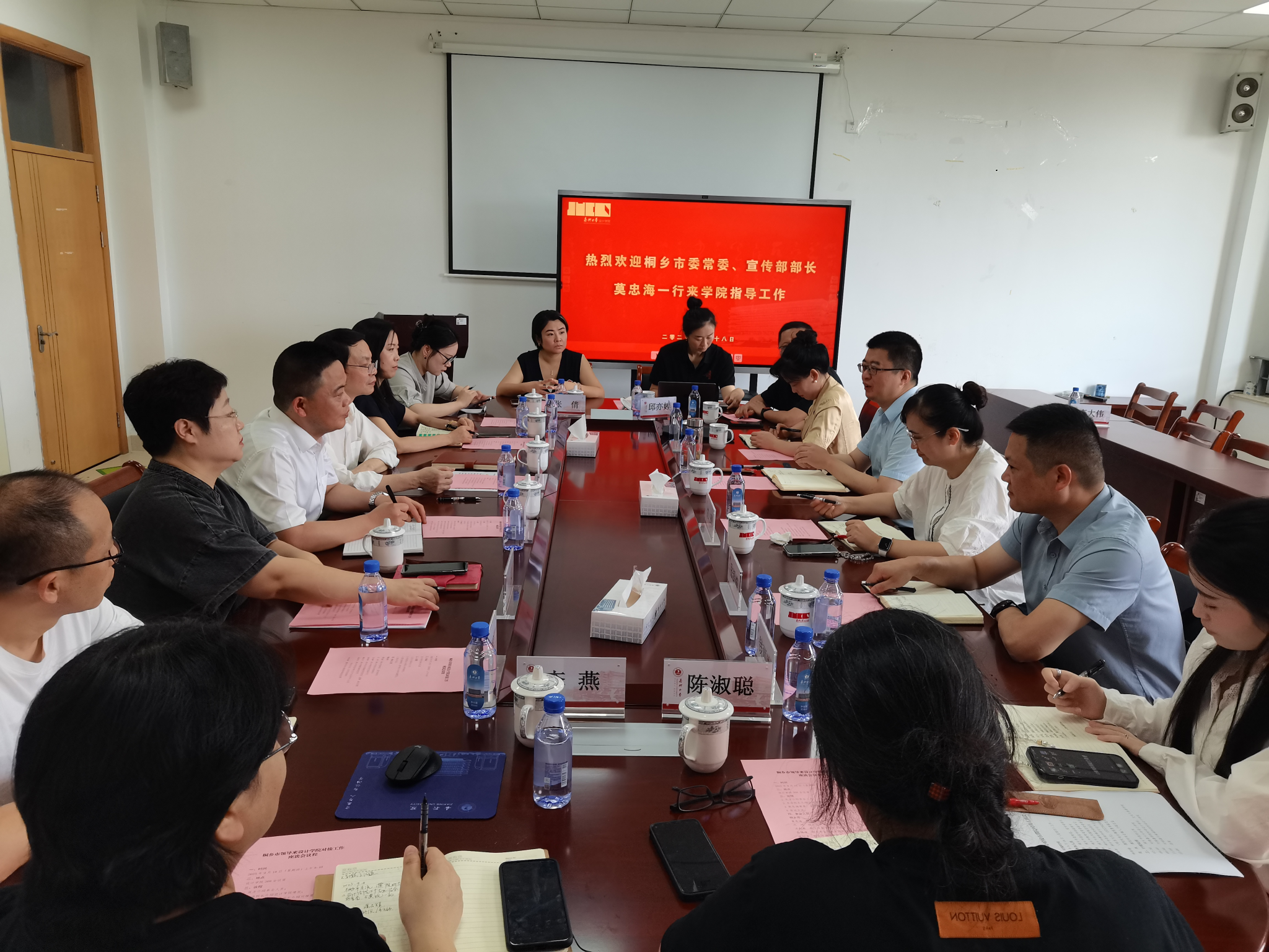 2025年9月18日上午,桐乡市委常委、宣传部部长莫忠海率队莅临365best体育亚洲官网,就濮院时尚古镇校地合作基地建设开展专项对接。桐乡市委宣传部副部长沈琦,市教育局党委副书记沈利敏,金凤凰集团党委委员、董事、副总经理张锡峰,濮院镇党委委员魏衍方,学院党政班子成员及相关专业负责人、系主任等参加座谈研讨。