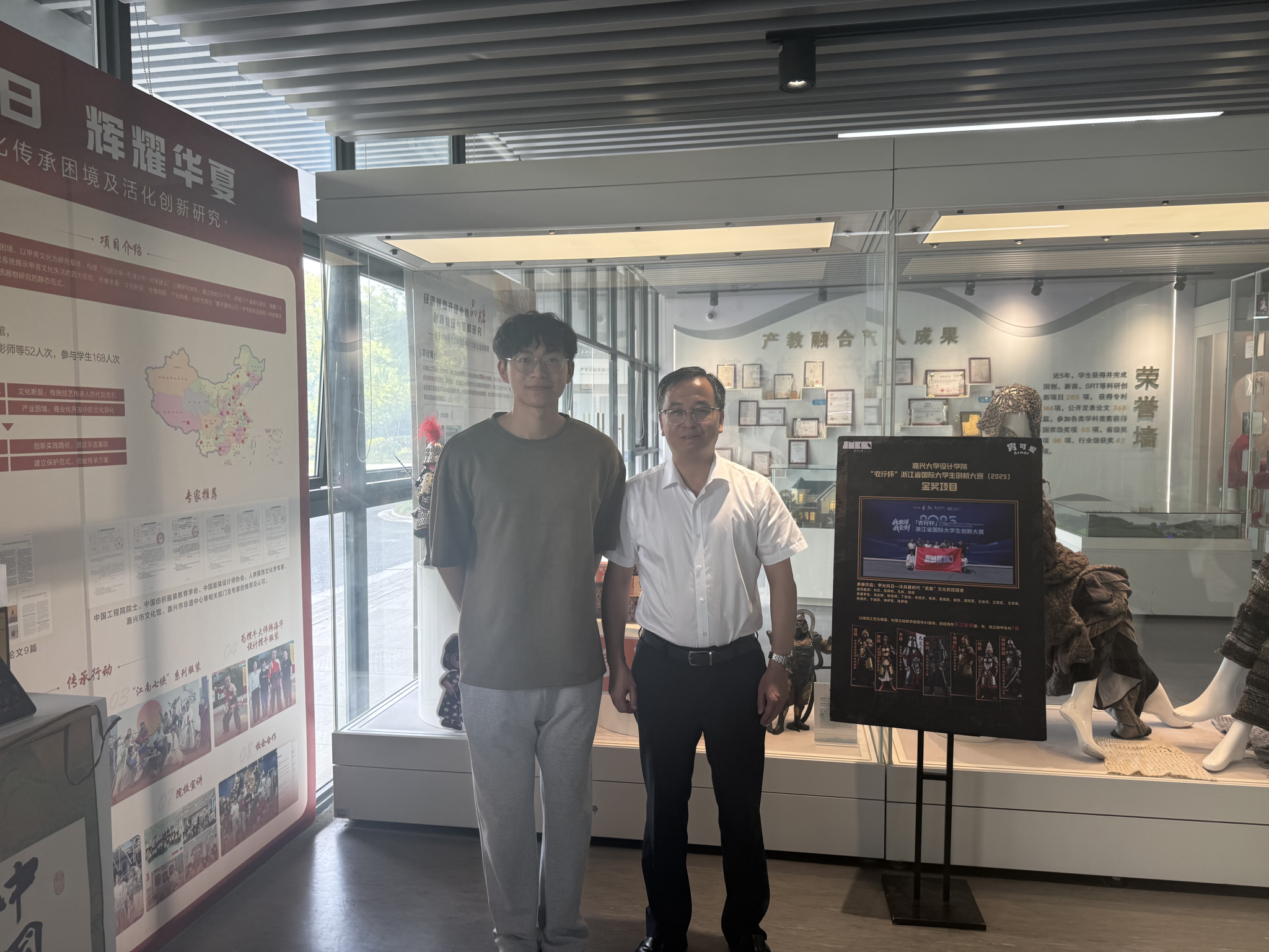 在听取浙江省国际大学生创新大赛(2025)金奖项目《甲光向日——冷兵器时代“武备”文化挖掘者》汇报后,梅德庆校长与团队学生代表亲切合影,并鼓励青年学子扎根专业、服务社会,在实践中锤炼本领。