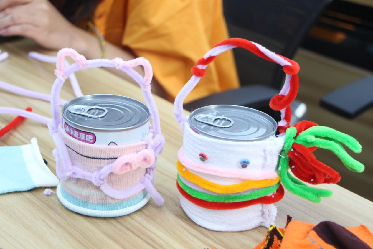 次日的创意盆栽课上,孩子们将旧袜子改造成独具特色的盆栽装饰。7岁的琪琪用粉色扭扭棒为盆栽制作了一副“俏皮墨镜”,引得小伙伴们阵阵欢笑;几个孩子合作完成的“彩虹条纹衫”盆栽,将不同颜色的袜子巧妙拼接,为绿植穿上了绚丽的新衣;还有小朋友缝制出可爱的袜子小熊,让它成为多肉植物的“守护者”。